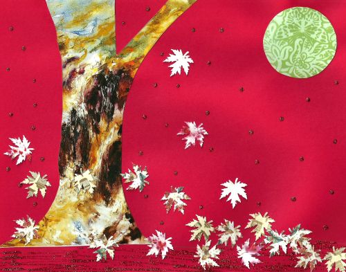 The story: One day, while researching how trees have been expressed in art, I chanced upon Gustav Klimt’s Tree of Life. I was aware of Klimt’s striking female forms, but new to me was his tree with branches spiraling against a solid sky. I wondered what such branches would look like dotted with leaves made of Japanese paper.