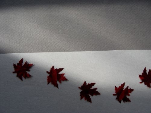The story: In reading “The Snowy Day and the Art of Ezra Jack Keats,” I was reminded of that striking scene in the picture book, The Snowy Day, when the little boy stands outside and is looking back at his footprints tracked through the snow. No footprints did I draw, but a trail of red leaves did come to mind, touched by sunlight.