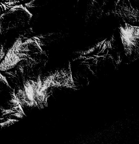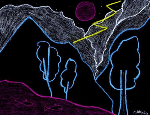 In fact, the landscape is two pieces of paper juxtaposed. I had been working with paper on the kitchen table when afternoon sunlight hit these two — a textured brown and a sheet of black — in such a way that I could not help but snap a photo. Later, on the computer, I desaturated the color and then my imagination took over. 😉