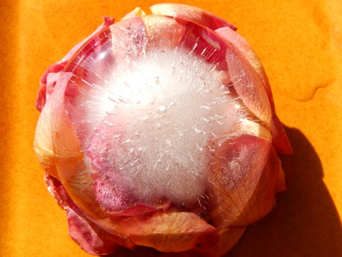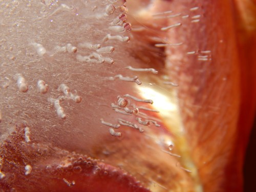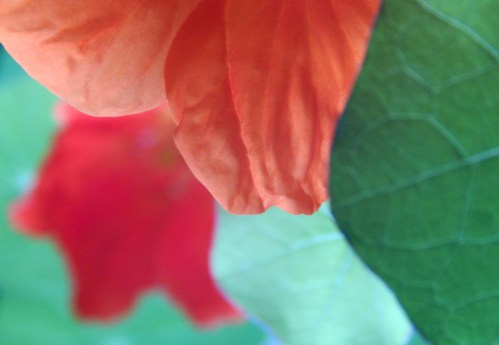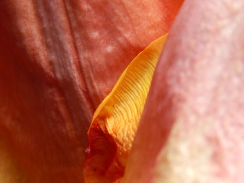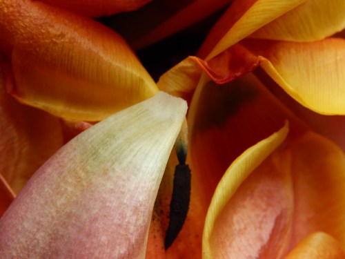 As I was observing tulip petals, holding them up to the light, I noticed in the tangle of oversprouted peas I have growing at my window, a single pea blossom. Will it bloom? Will a pea pod form? Time will tell. Meanwhile in a moment of whimsy I decided to photograph my blossom against a background of tulip petal. No meaning. No expectation. Just indulgence in curiosity.