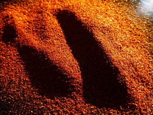 Yesterday, in a coffee-stained manilla folder, I found an old personal essay. I almost posted it on this blog but I remained indecisive about the imagery with which to pair the words. Embedded in the text was a reference to red dust and that was the image I most wanted — little pyramids of red — but the dust in the story is red Virginia clay not dark Massachusetts soil. I tried photographing mounds of smoky paprika but the imagery just didn’t work.