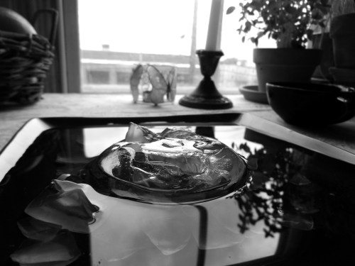 blue stone in water and branches reflected, tilting the bowl