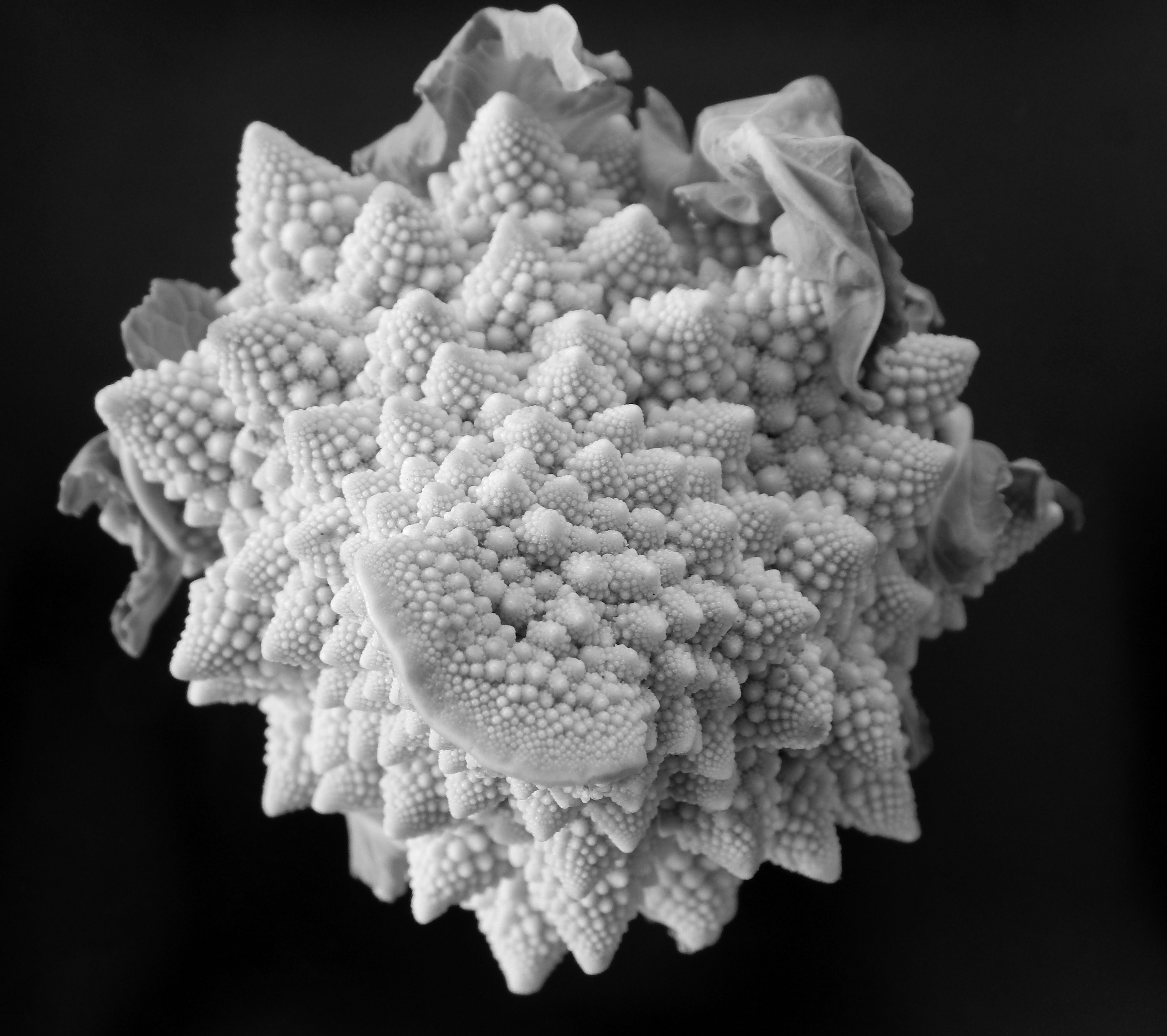 When a certain physicist I know tells me excitedly that he picked up something really cool for me to photograph from the farmer’s market, I know that it will undoubtedly be an edible object that in some way visualizes some fundamental principle about how the world works. In this case it was a head of romanesco broccoli with its beautiful repeating pattern that is a “natural representation of the Fibonacci … a logarithmic spiral where every quarter turn is farther from the origin by a factor of phi, the golden ratio.” (source)