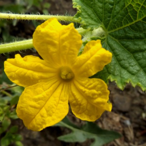 eggplants blossoming in dark purple and pumpkins blooming in bright gold
