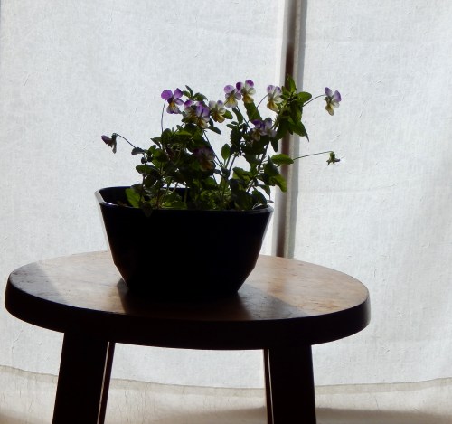 I could have eaten them, you know. Violas are edible but now I too wanted to see what would happen over time. The blooms made people who were visiting, who were perhaps not in a happy space, smile as they walked past the bowl. And even I, who can on occasion not find the bright side, they too made me smile as the sun struck the purple and gold.
