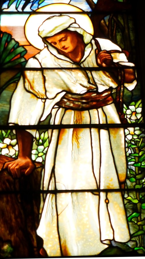 With more time available, I was able to return to the Church of the Covenant on Newbury Street in Boston. Given the time of day and the angle of the light, I was drawn to photograph what I later learned to be the Sparrow window. Here’s what the church’s self-guided tour brochure says: “Based on one of Jesus’ parables, the Sparrow window is a tour-de-force of Tiffany art using drapery or ribbed glass for clothing, and mottled glass or confetti glass for the background. Frederick Wilson designed this image of Jesus as a young working carpenter, with a yoke on his back, pausing to sympathize with the plight of a small bird that only he can see clearly.”