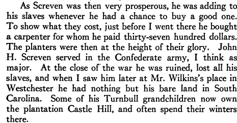 At the end of the chapter Armstrong describes how that period in the south was one of the most delightful times in his life. No cares, no worries. He would receive a letter decades letter from a family member describing the loss of the plantations and the slaves, the occupation by Union troops, and the auctioning off of property to pay debts.