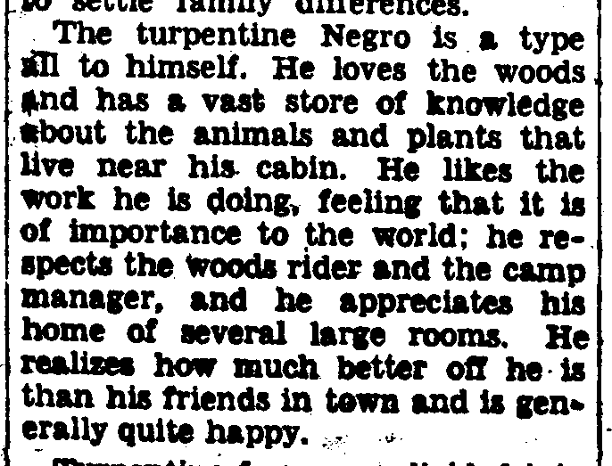 In a 1903 New Orleans newspaper they were described as the worst character of criminal for the police to deal with when they came to town to spend their money. I suspect there were few things worse than to call a successful Black man a “turpentine nigger” nor was it uncommon for a person of color to say, “What do you think I am a turpentine nigger?”