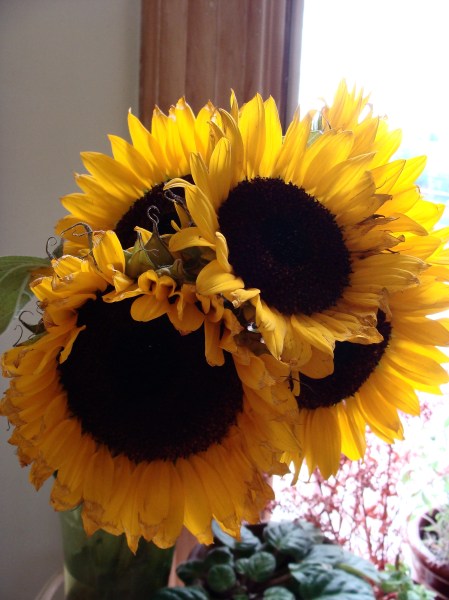 As for these sunflowers, they were to be found in Boston’s Copley Square as I dashed through the Farmers Market this past Friday. A delightful sight, living up to their name, like the sun come down to the ground.