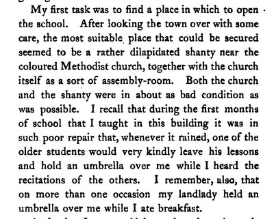 Years late, Booker T. Washington would describe the moment in a slightly different way. In 1901, Washington wrote Up from Slavery, the chronicle of his journey from slavery, his attendance at Hampton and eventual leadership at Tuskegee and well beyond. As Washington wrote, money had been found to start Tuskegee, with money set aside to pay future instructors, but no provisions had been made for securing land and buildings.