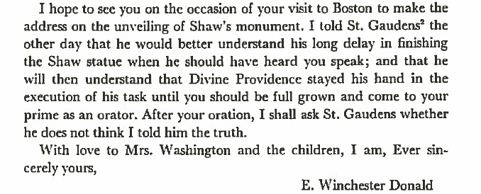 Though from two very different backgrounds, Donald and Washington appear to have greatly respected one another. In 1895 Donald established the Trinity Church Oratorical Prize, an award for the best written and best delivered paper on an assigned subject, a student prize that continues at Tuskegee, with different sources of funding, to this day. For many reasons, Washington often made his way up North, cultivating philanthropists, accepting honorary degrees, attending national conferences, and speaking in places like Trinity. In 1897 he was invited to deliver an address at the dedication of the Robert Gould Shaw Monument in Boston. Prior to his arrival, Donald sent him a letter:
