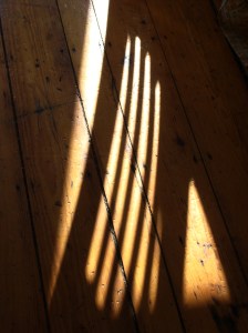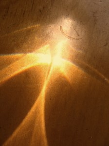 Lots of bright sunlight shining through the kitchen windows and then through empty glasses sitting on a table. The result: beautiful shadows and flashes of color.