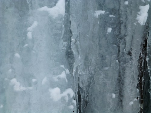 The light was fading fast, and coming in at odd angles over the hills and through the trees. I was cold and not happy for lots of reasons. But, then I paused to take a sip of water. A glimmering on the land caught my eyes. Upon closer scrutiny, I realized that what I had first assumed was simply more ice on rocks was in fact a stream. Beneath a thick, clear glassy seal, its waters ran swift. We followed those waters to where they eventually cascaded over rocks as a waterfall.