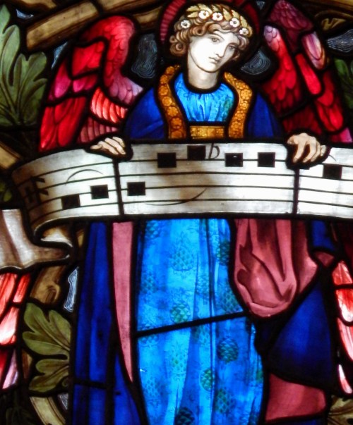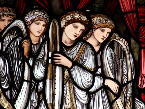 In time for the holidays, at the gift shop located at Trinity Church in Copley Square, you will soon find items featuring one of the most striking and provocative images that I have ever taken … probably because the source of the image is so striking and provocative. I think of them as angels though they are harpists robed in white in one corner of the stained glass window, David’s Charge to Solomon, by Edward Burne-Jones and William Morris & Co.